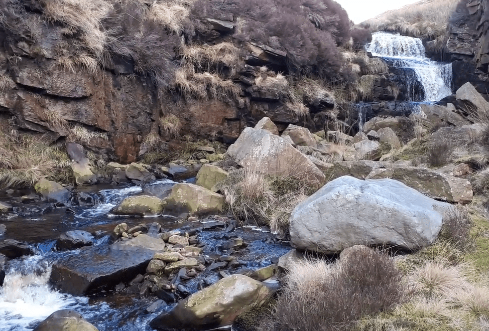 End point: above the final two (or one-and-a-half) waterfalls below Tooleyshaw Moor (OS Grid Ref: SE 08149 03307)