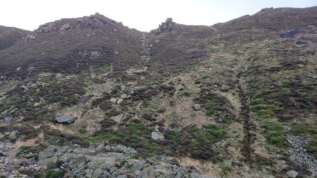 End point: where you meet the path along the tops at SE 02776 01536, having ascended around 100 metres